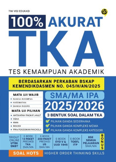 Buku 100% AKURAT TKA SMA/MA IPA 2025/2026 adalah panduan terlengkap dan paling akurat untuk membantumu lolos seleksi perguruan tinggi impian. Buku ini disusun berdasarkan kisi-kisi resmi TKA SMA/MA IPA terbaru dari Perkaban BSKAP Kemendikdasmen Nomor 045/H/AN/2025, memastikan setiap materi yang kamu pelajari sudah pasti relevan dengan format ujian yang akan datang.