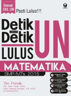 Buku Detik demi Detik Lulus UN Matematika SMP 2015 yang kalian pegang sekarang ini disusun berdasarkan kisi-kisi Ujian Nasional. Materinya sudah menjadi jaminan sebagai materi yang akan keluar dalam Ujian Nasional. Secara umum, buku ini dibagi dalam empat bagian. Bagian pertama berisi materi (yang disesuaikan dengan SKL), bagian kedua berisi soal-soal dan pembahasan UN Matematika 2013, bagian ketiga berisi soal-soal UN Matematika 2014, dan bagian keempat berisi soal-soal prediksi UN Matematika 2015. Strategi yang harus dilakukan agar lulus dengan hasil yang memuaskan adalah 1. Mantapkan pemahaman materi Hal ini penting agar tidak kelabakan saat ujian sudah semakin dekat. Konsentrasi pada materi yang dirasa sulit. Tuliskan rumus-rumus dan pengertian penting agar bisa selalu terbaca atau dengan cara lain yang lebih unik dan menarik. 2. Mintalah SKL (Standar Kompetensi Lulusan) SKL ini berfungsi sebagai panduan mengenai materi apa saja yang harus dipelajari menghadapi UN. Dari pengalaman, SKL ini tidak jauh berbeda dengan SKL tahun-tahun sebelumnya. 3. Berlatih mengerjakan soal UN Soal-soal UN sebenarnya hampir mirip dengan soal-soal tahun sebelumnya. Jadi, biasakan diri untuk sering mengerjakan soal UN. Jika tidak paham tanyakanlah pada guru atau teman yang lebih pintar. 4. Ikuti Try Out UN Biasanya menjelang UN banyak sekali bimbel atau organisasi yang menyelenggarakan Try Out ujian nasional. Try Out ini berguna untuk mengukur seberapa jauh menguasai dan mendalami materi-materi yang akan diujiankan. 5. Berdoa Jika ikhtiar dan usaha telah dilaksanakan, maka tiba saatnya menyerahkan segala sesuatunya kepada Tuhan yang maha kuasa. seringlah berdoa agar dibukakan pikiran dan diberi pemikiran yang jernih serta hati yang tenang.